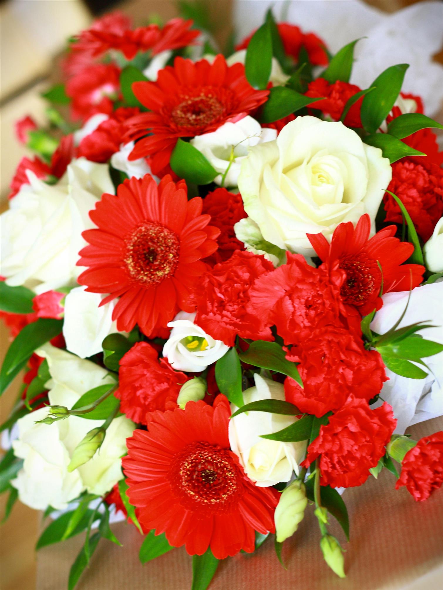A close up of the brides bouquets with bright contrasting colours. The Bride looked stunning with this trailing bouquet set off superbly against the bright white wedding dress     And to finish is the beautiful bridesmaids contrasting their white bouquets against the fabulous red dressesRead More