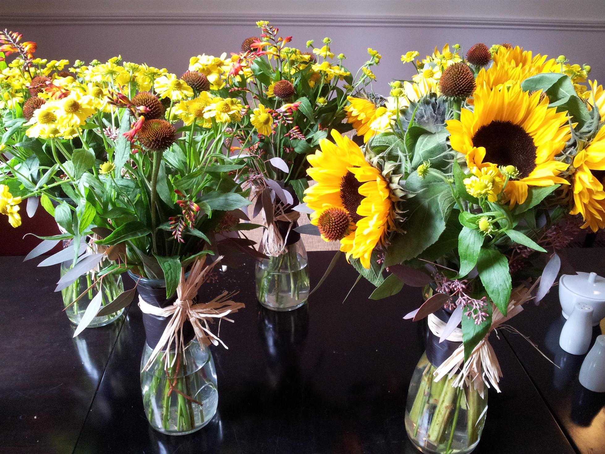 Carafe's filled with sunflowers from last weekends wedding. Simple yet very effective and not going to blow the budget. Guests get to take them home at the end of the day too !Read More