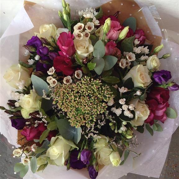 Very pretty bouquet today with ivory roses, wax flower, purple and pink lissianthus and delicate white bouvardia. Read More