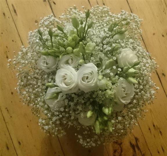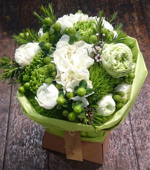 The wedding season is pretty much all year round now. The crisp whites and greens in this bridal bouquet really work. Touches of white hydrangea give a lovely frilly texture along with the green hypericum berries. Perfect ! Read More