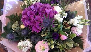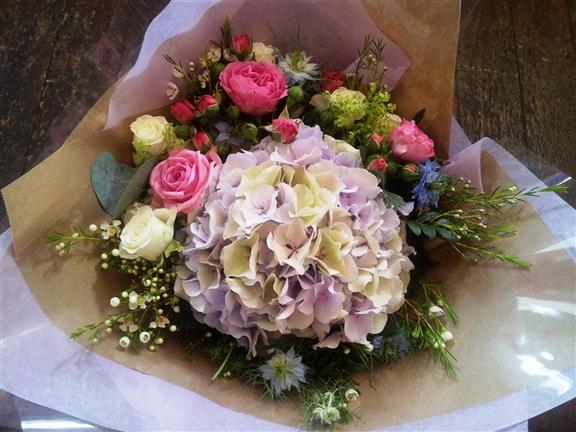 This was a chance to do something really different by contrasting the huge head bloom of the hydrangea with the smaller roses, spray roses and white September,  all mixed together to create this wonderful bouquet. Read More