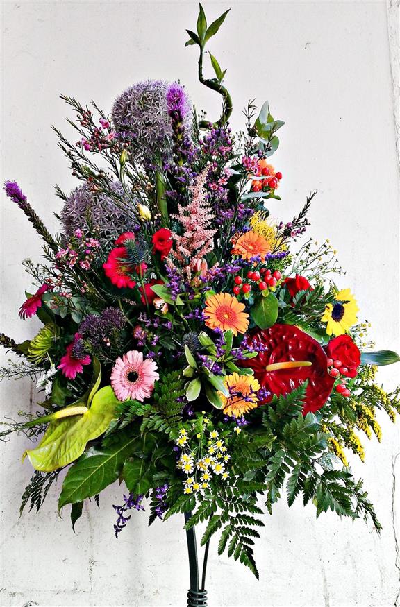 Wreaths, sprays, and posies made with seasonal flowers and natural foliage.