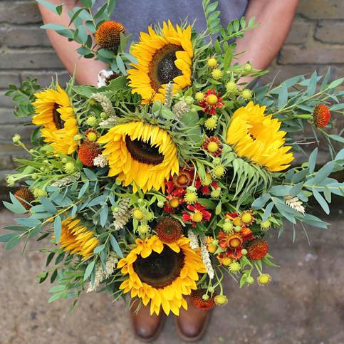 A traditional style bouquet of sunflowers with a touch of orange and deep burgundy, a real summer favourite.