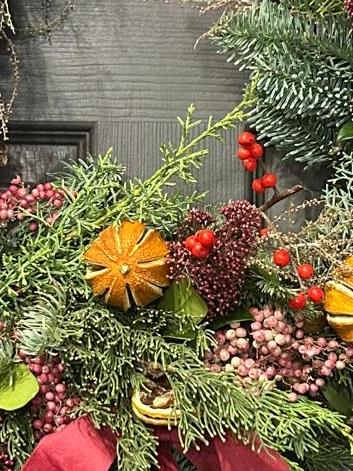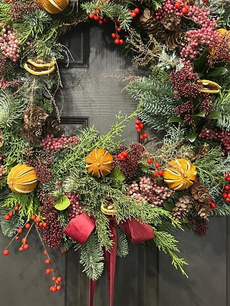 A natural, handcrafted wreath is made on an eco-friendly wire and moss frame, filled with dried citrus pieces, fresh foliage and seasonal decorations to create a stunning centerpiece for your door or mantel.