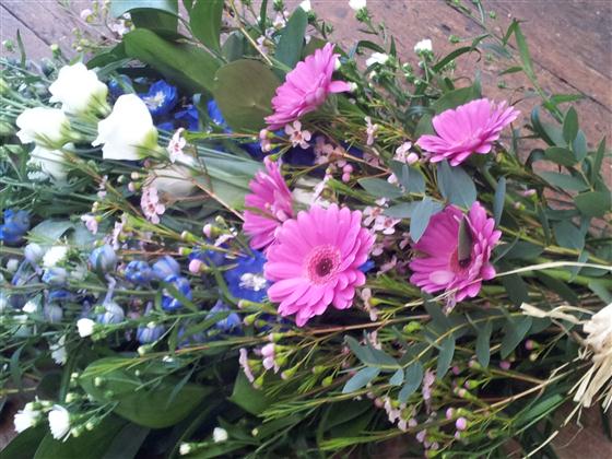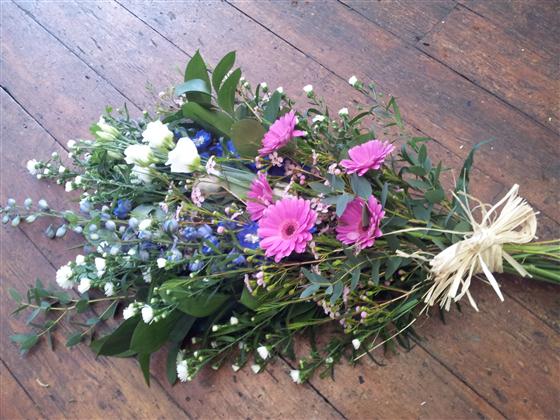 Beautiful blue delphiniums, white lissianthus and pink germini form this delicate and pretty natural sheaf.