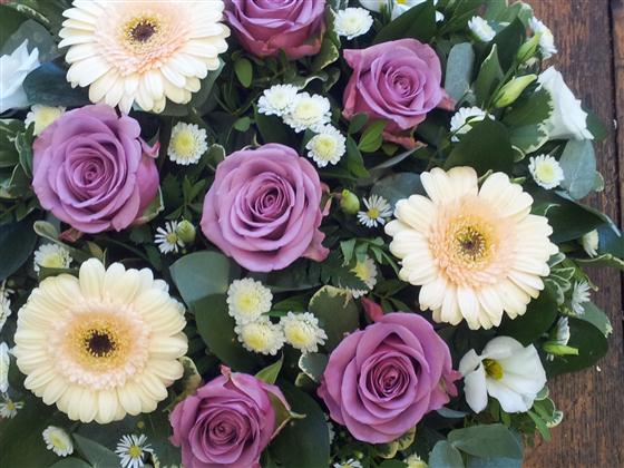 Antique lilac roses set against peach germini are the feature flowers in this delicate posy.