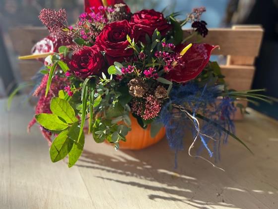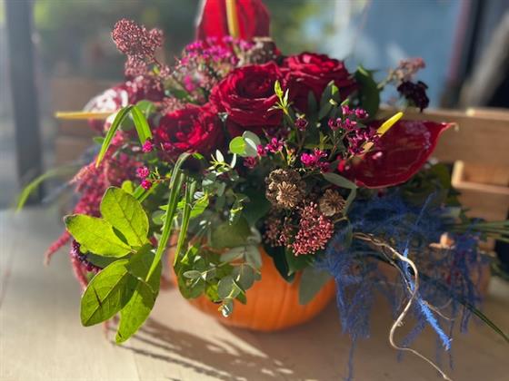 Get fully immersed into spooky season with this stunning floral arrangement in a pumpkin.