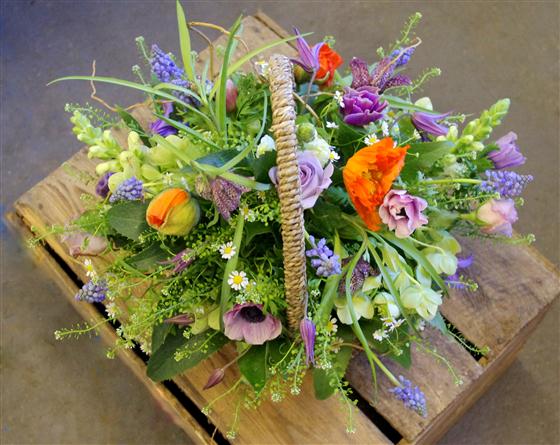 A beautiful basket arrangement showing off the best that spring has to offer in warm tones, exact contents will vary depending on availability, quality and allowing our talented florists to create something just as stylish whilst offering the best possible value for money. This basket is all about quality not quantity.