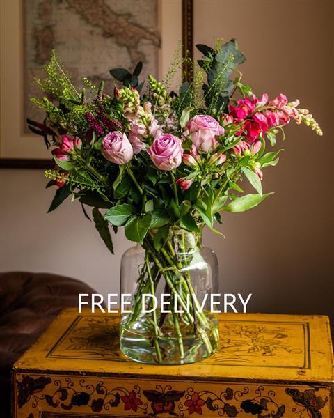 A gorgeous bouquet of seasonal flowers and roses in lavish tones of pink and red accentuated by lush foliage giving a rich feel of decadence and style. This stunning bouquet of flowers will stand out and fill the room with a sense of calm and well-being.