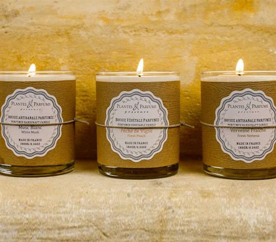 Perfumed hand poured vegetable wax candles, handmade in Provence. Candles are hand poured in our workshops, made from 100% vegetable wax without paraffin and 100% natural cotton wicks.