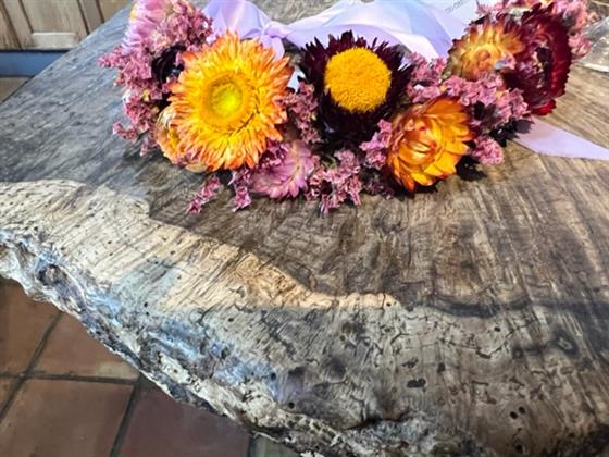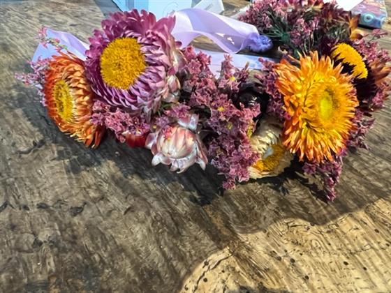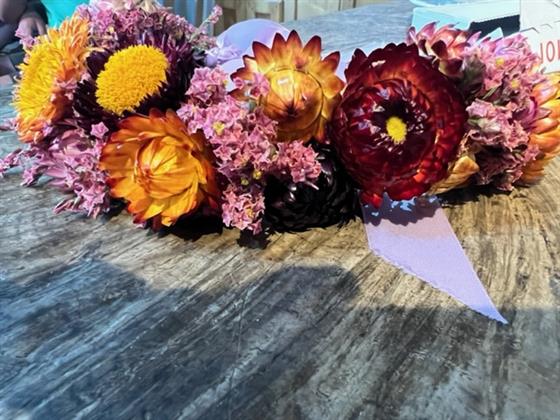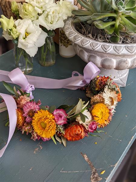 A colourful flower crown made from Helichrysum and Limonium, finished with satin ribbon tails to adjust to different head sizes. This fresh flower headgear will dry and retain it's summery colours so you can wear it with all of your queen worthy outfits.